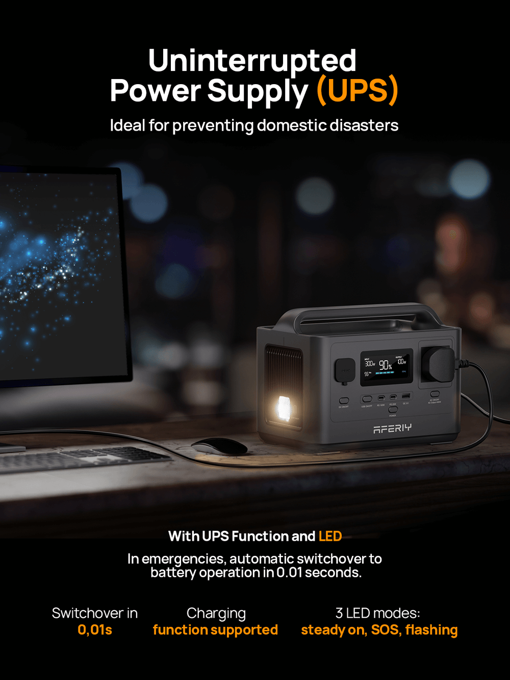 The AFERIY P040 400W portable battery pack features a UPS (uninterruptible power supply) function with ultra-fast switching (< 10ms), ensuring continuous power supply and protecting your sensitive devices in the event of a power outage.