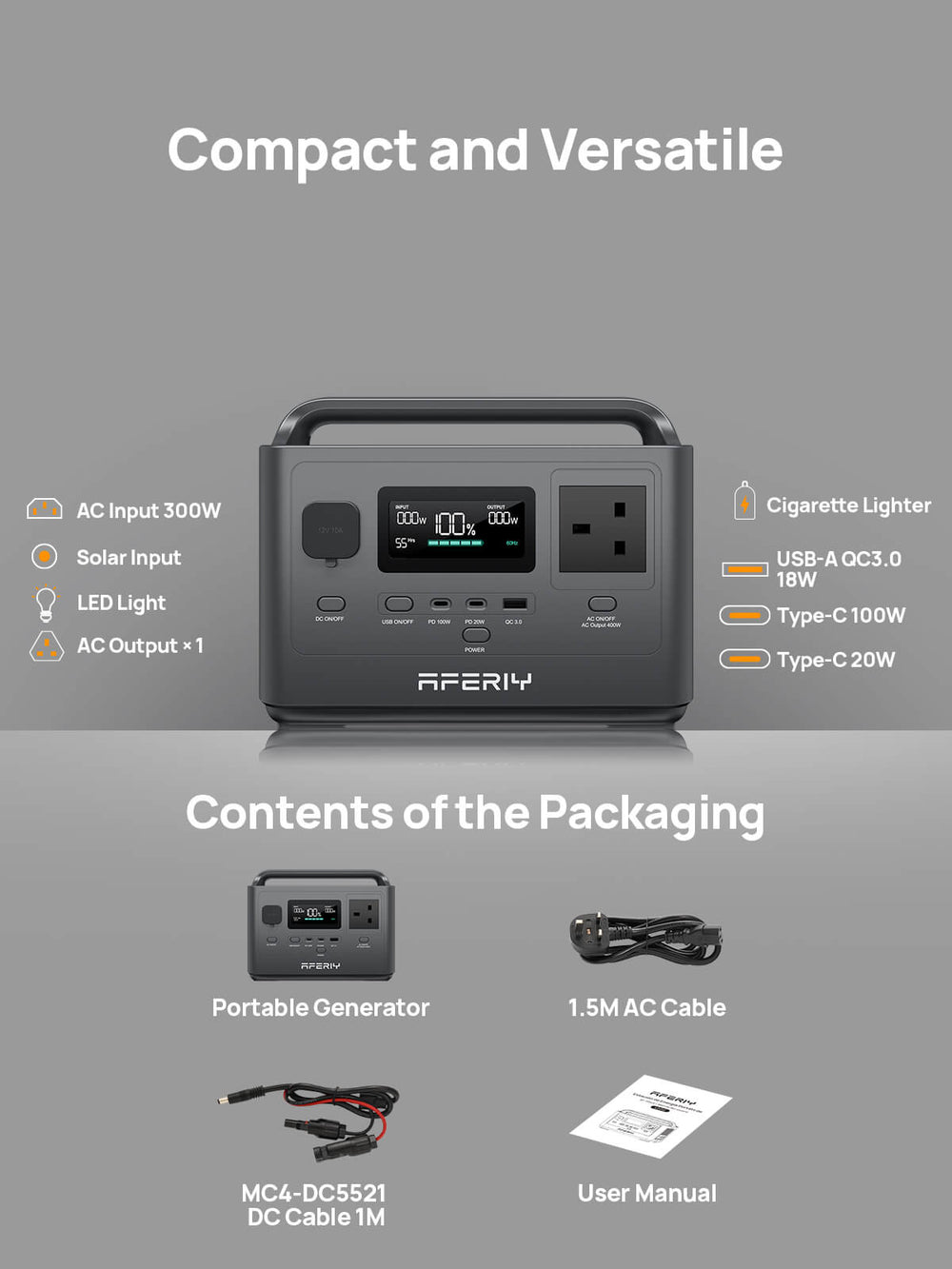 The AFERIY P040 400W portable power station comes with everything you need for immediate use. The package includes: a P040 portable power station (400W), an AC charging cable, an MC4 to DC5521 connection cable, and a clear and comprehensive user manual to guide you step by step.
